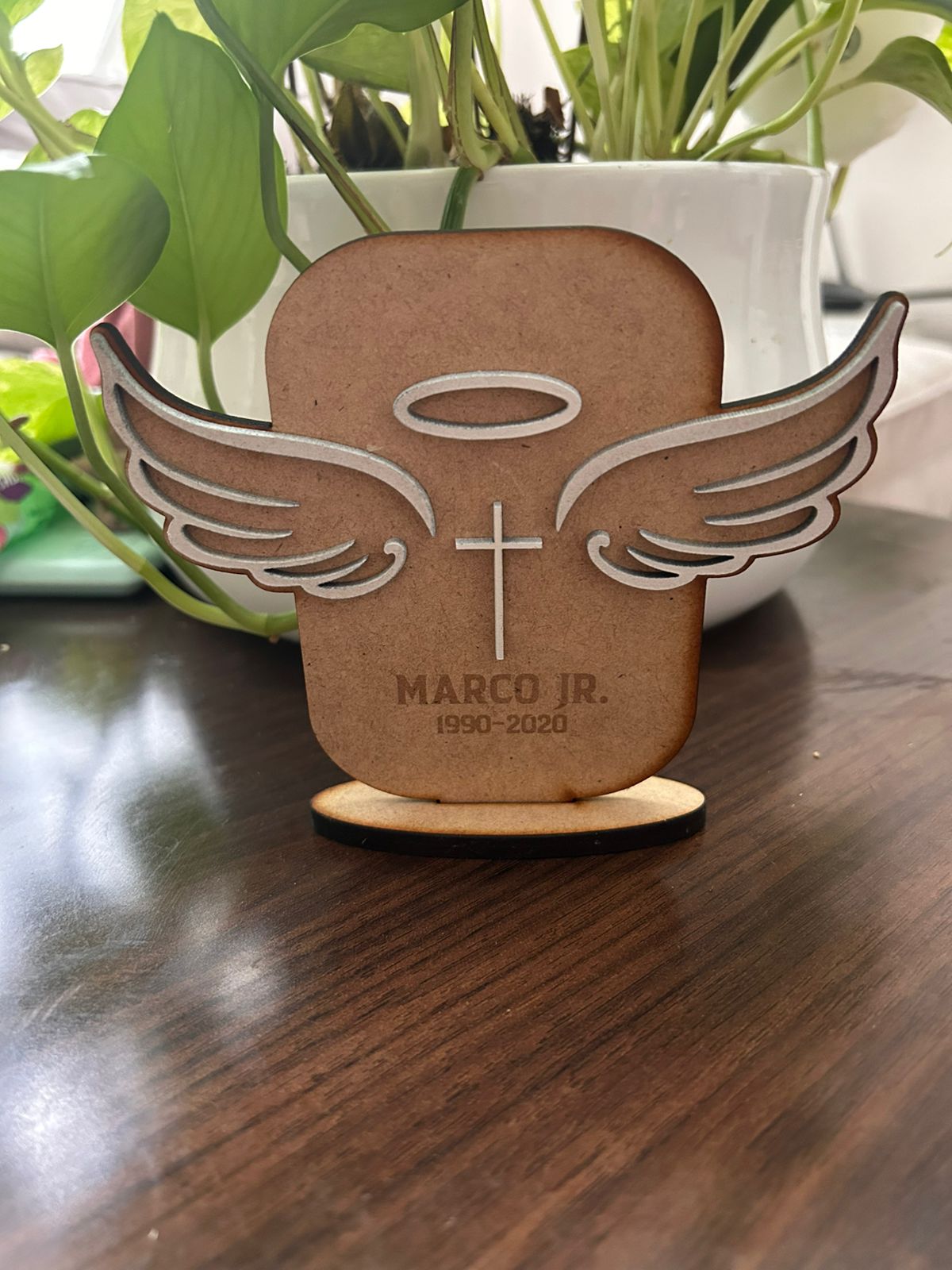 Recuerdo luctuoso en MDF, alas pintadas a mano, y grabado personalizado en laser, medidas 15.0 cm de ancho por 12.0 cm de alto, incluye base.